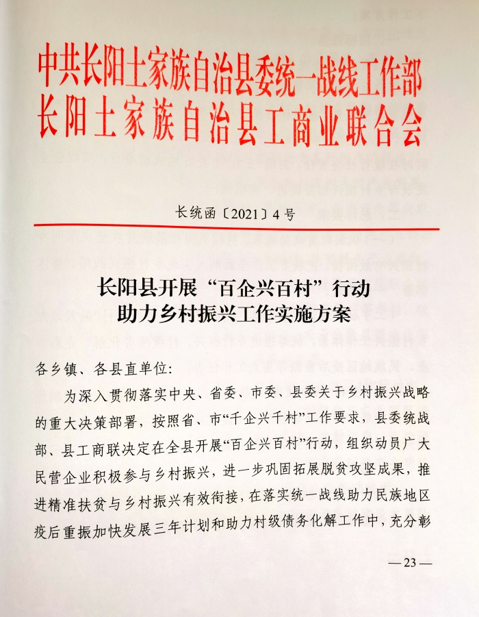 2021年4月2日,中共长阳土家族自治县委统战部、县工商业联合会联合召开全县民营企业助力乡村振兴暨“百企兴百村”工作动员大会。湖北永润建设工程有限公司作为参会的146家民企中的一员,与渔峡口施坪村成为了结对联建伙伴。