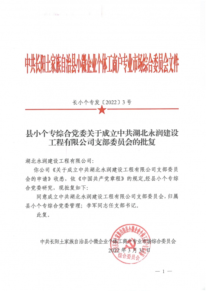 经县小个专综合党委党委会审定,于3月31日下发《县小个专综合党委关于成立中共湖北永润建设工程有限公司支部委员会的批复》文件,同意成立中共湖北永润建设工程有限公司支部委员会,归属县小个专综合党委管理,李军同志任支部书记。