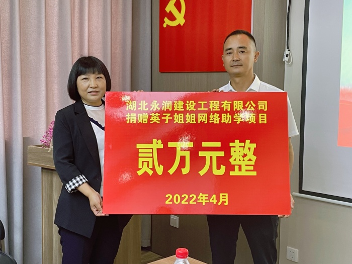 值此公司党支部成立之际,为发挥党组织的思想引领及行动示范作用,湖北永润建设工程有限公司向英子姐姐网络助学平台捐赠贰万元。英子姐姐网络助学团队顾问聂德媛对此次捐赠表达了衷心的感谢,对湖北永润建设工程有限公司成立至今所取得的成绩表示了肯定,并介绍了“英子姐姐网络助学平台”的基本情况和“英子姐姐”的先进事迹。